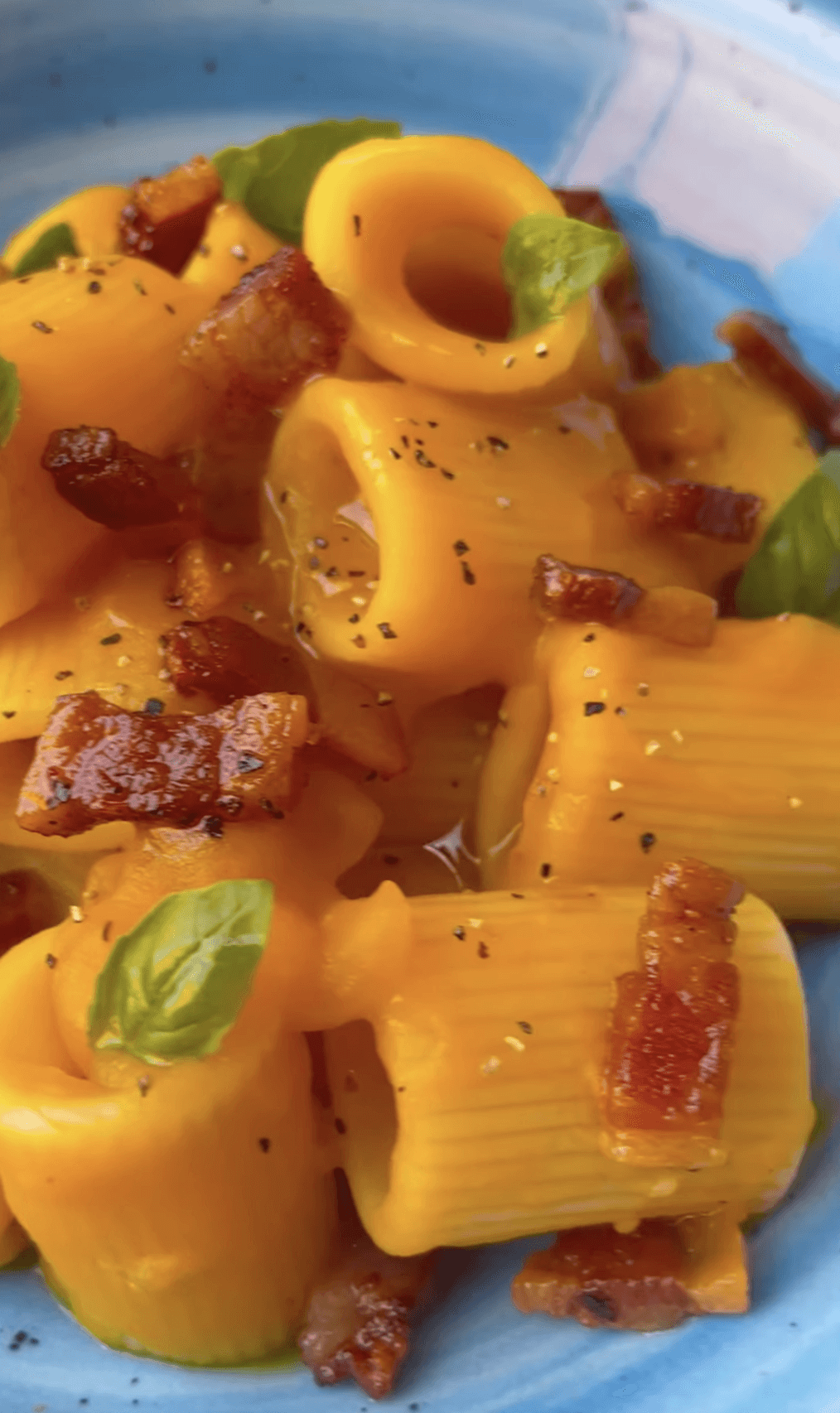 Mezze maniche con crema di zucca, guanciale croccante e pecorino